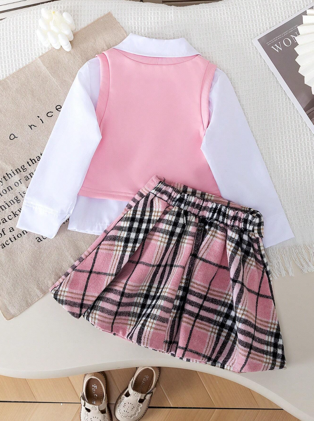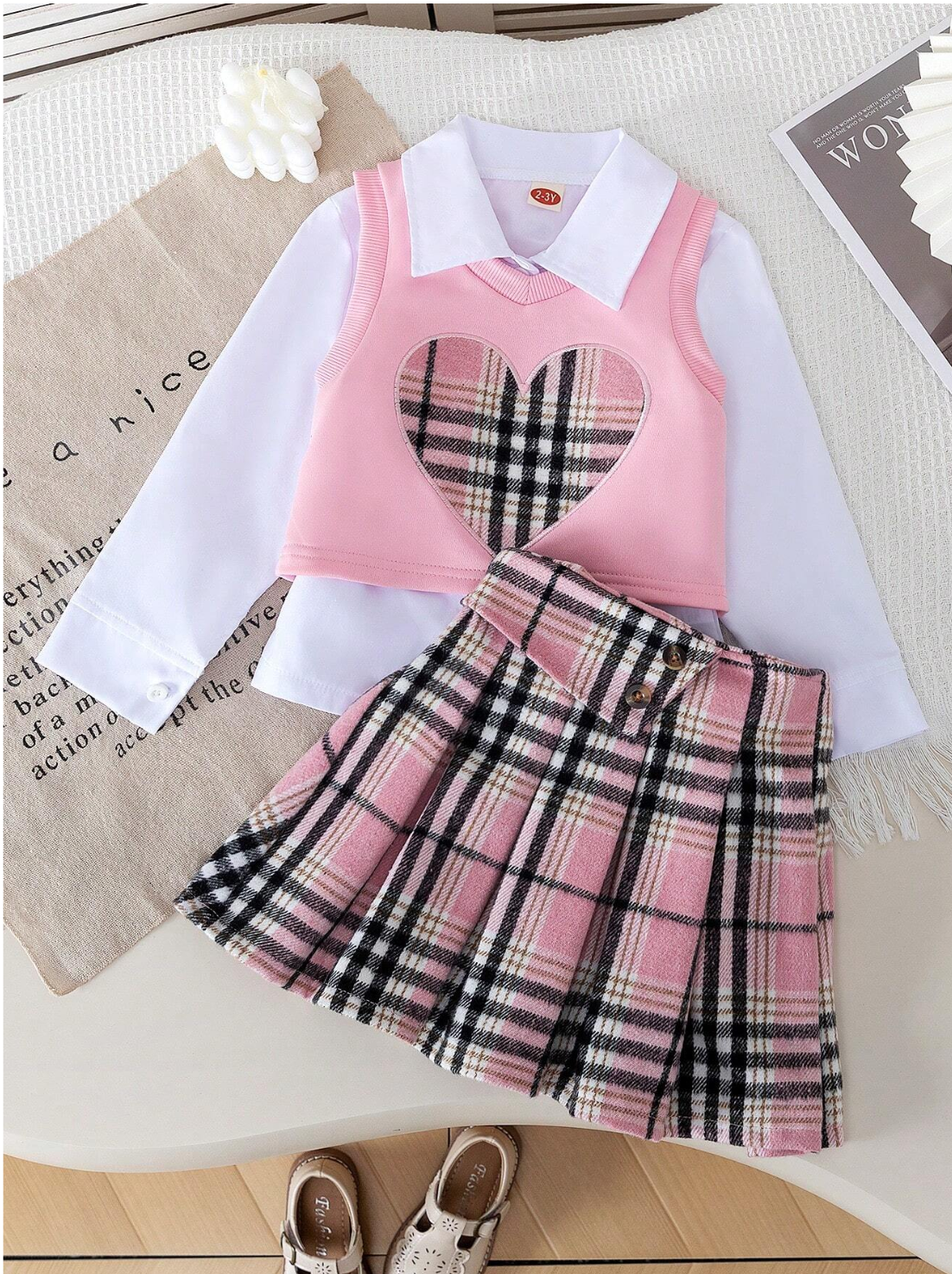 Ensemble 3 pièces Chemise unie casual, Gilet à motif de cœurs à carreaux et Jupe à carreauxDA 5,500.00DA 7,200.00